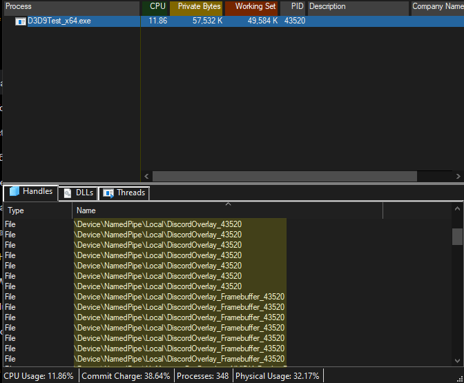 The simplest demonstration of this technique would be to create a named file mapping object of FILE_MAP_ALL_ACCESS to DiscordOverlay_Framebuffer_Memory_XXXX.